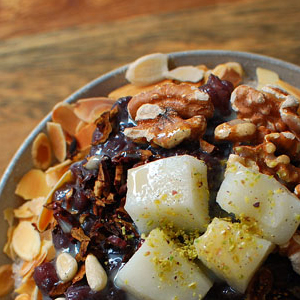 호두,아몬드,땅콩,잣등 건강식품으로 만들어진 팥빙수입니다.